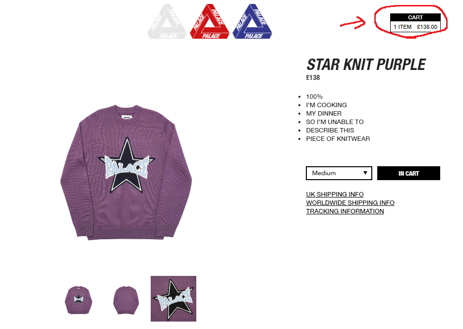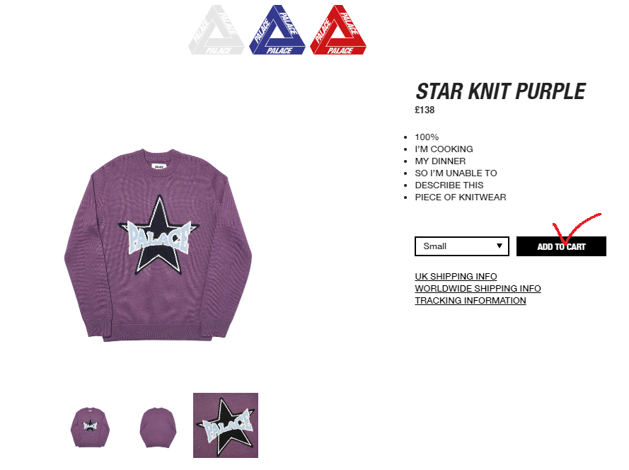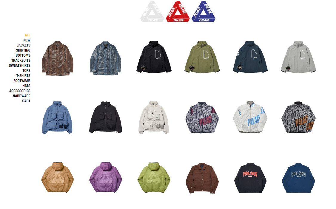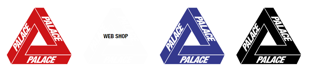 공식 홈페이지의 주소(https://shop.palaceskateboards.com/)는 사진과 같은 형태로 나타나며 왼쪽부터
