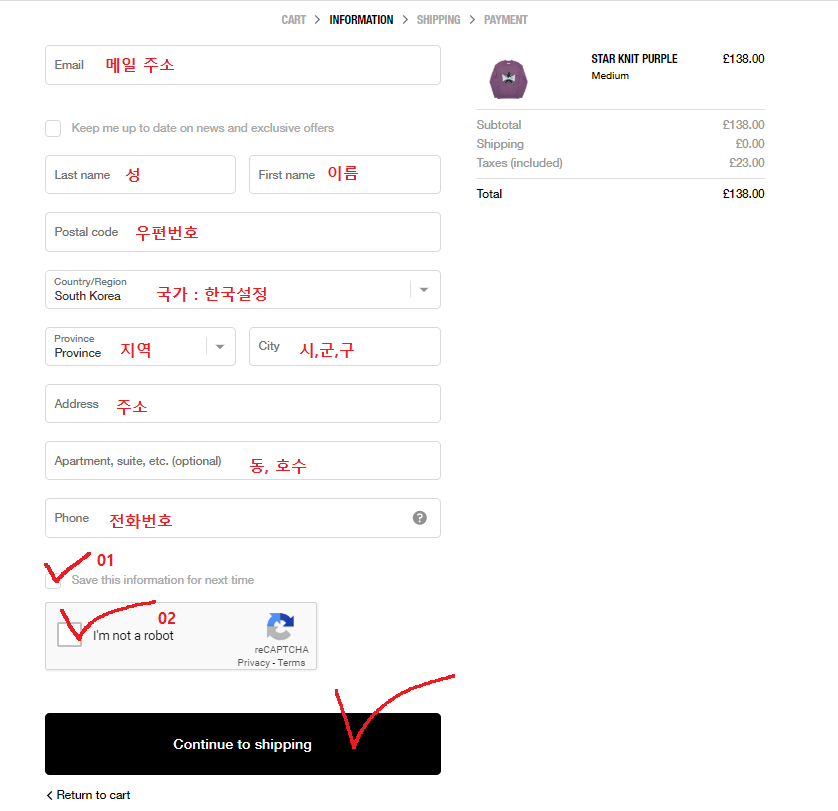 주소 입력화면에서는 한국으로 배송을 하기위해 국가를 한국으로 설정하는게 가장 우선적으로 필요로합니다.