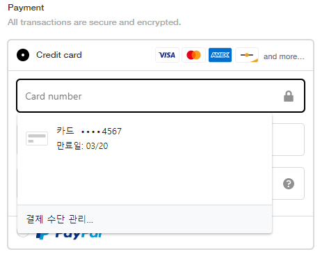 01결제 페이지 슬라이드 쇼 카드도 역시 Card number를 클릭하면 기존에 등록 되었던 카드의 정보들이 나옵니다.