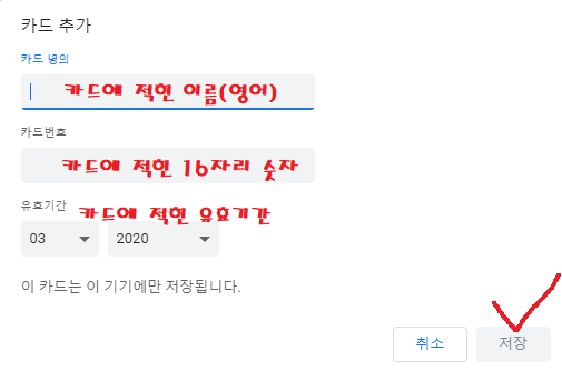 01결제 수단 추가 슬라이드쇼 본인이 가지고 있는 카드를 보며 위와 같이 작성을 해주도록 합니다.