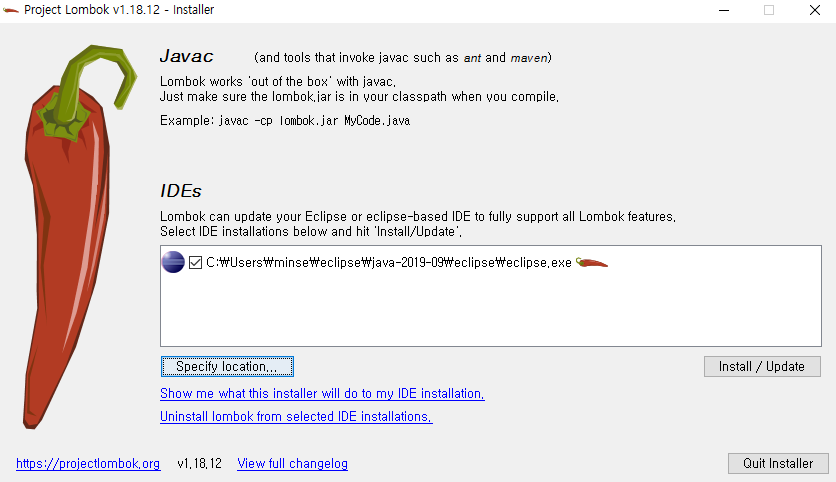 lombok 실행화면 실행을 하게되면 위와같이 lombok이 뜨는데 eclipse.exe 옆에 빨간색 고추가 있는것은