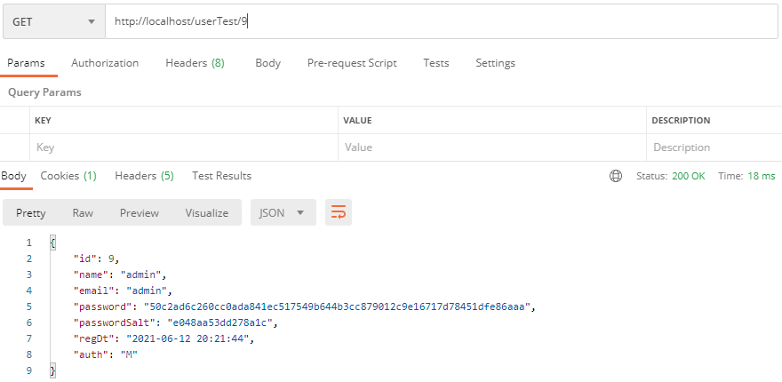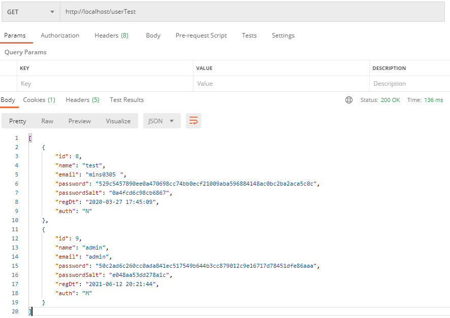 @Slf4j // 제일 앞 중복 URL 적용 @RequestMapping(value="userTest") @Controller public class UserContorller { @Autowired UserRepositoryService userRepositoryService; // 모든 사용자를 조회 @GetMapping(produces = {MediaType.APPLICATION_JSON_VALUE}) public ResponseEntity<List<UserVO>> getAllUser() { List<UserVO> users = userRepositoryService.findAll(); return new ResponseEntity<List<UserVO>>(users, HttpStatus.OK); } // 한 명의 사용자만 조회 @GetMapping(value="/{id}",produces = { MediaType.APPLICATION_JSON_VALUE } ) public ResponseEntity<UserVO> getUser(@PathVariable("id") Long id) { Optional<UserVO> user = userRepositoryService.findById(id); return new ResponseEntity<UserVO>(user.get(), HttpStatus.OK); } }- 동작 확인